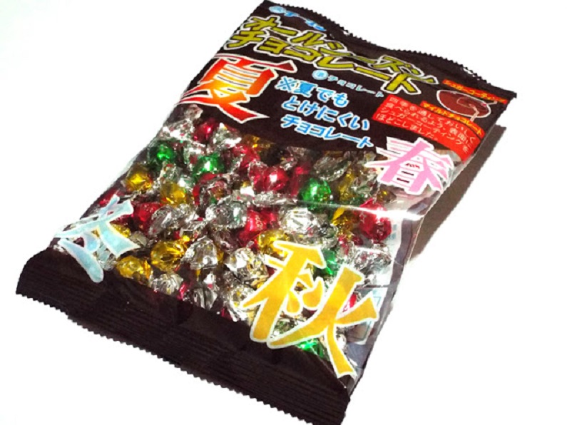 同チョコは、チョコ玉の表面をシュガーコーティングしたものです。糖衣されていない場合、暑い時期にはチョコレートは溶けてしまいますが、覆うことで気温が高い季節にも比較的強いものに仕上がるそうです。この技術を応用して、春夏秋冬いつでも食べられるチョコレート、オールシーズンチョコも販売しています。