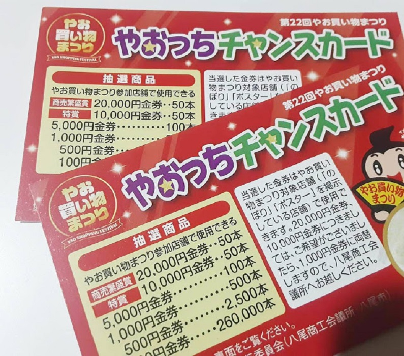 第22回やお買い物まつりとは、八尾商業まつり開催実行委員会が主催となり、金券が当たるスクラッチくじ(やおっちチャンスカード)をお買い物金額に応じて配布しているものです。参加店舗は八尾市内のお店1,200店舗以上となっており、chim-chimもその1店舗です。