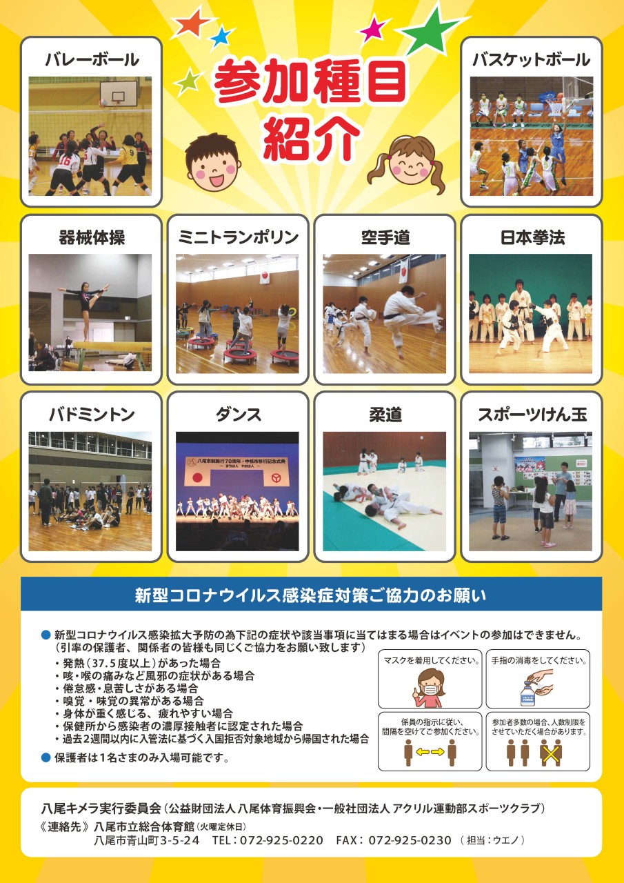 八尾キメラとは、子供たちが単一のスポーツだけでなく、複数の競技に見て触れて、自身に適したものと出会ってもらうためのイベントとなっています。