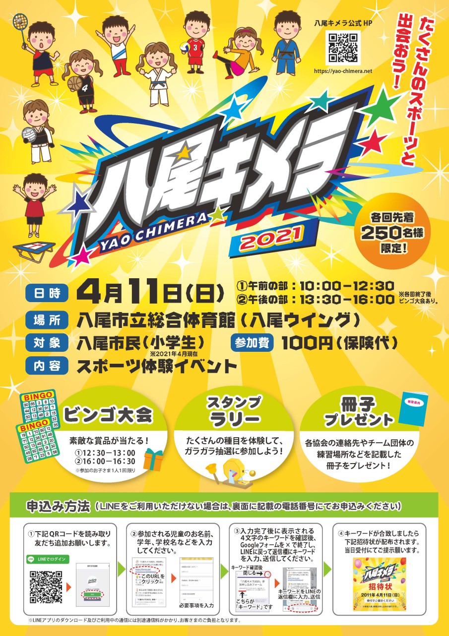 八尾キメラとは、子供たちが単一のスポーツだけでなく、複数の競技に見て触れて、自身に適したものと出会ってもらうためのイベントとなっています。