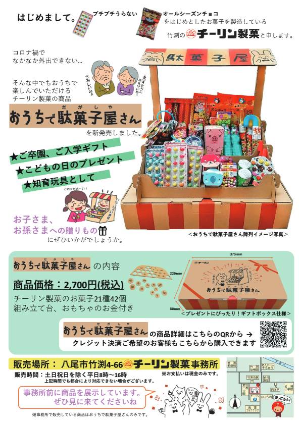 大阪府八尾市にあるチーリン製菓(八尾市竹淵4-66)はこのほど、おうちで駄菓子屋さんの販売を開始しました。この商品は、ギフトボックス仕様となっており、組み立て台を組み立てると陳列棚に変身。子供たちが駄菓子屋ごっこができる仕組みとなっています。